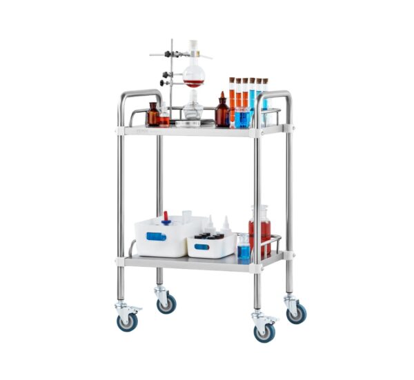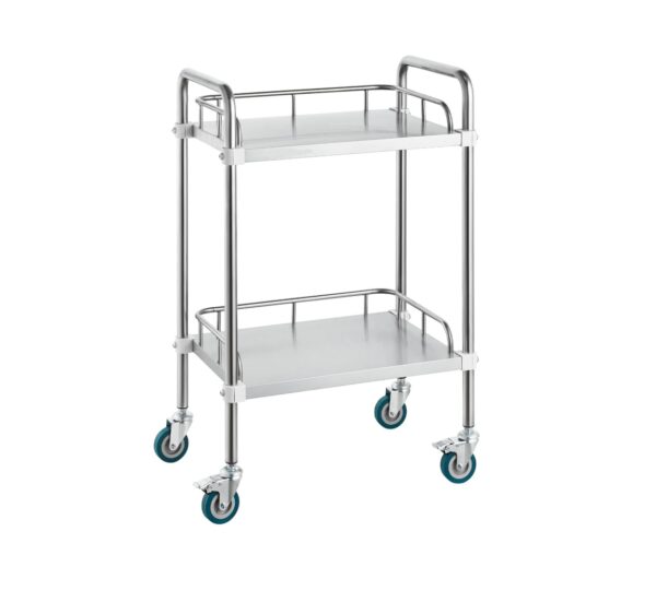 Tavoline profesionale inoks me 2 nivele dhe rrota me fren, e përshtatshme për laborator, klinikë, kuzhinë dhe sallone.