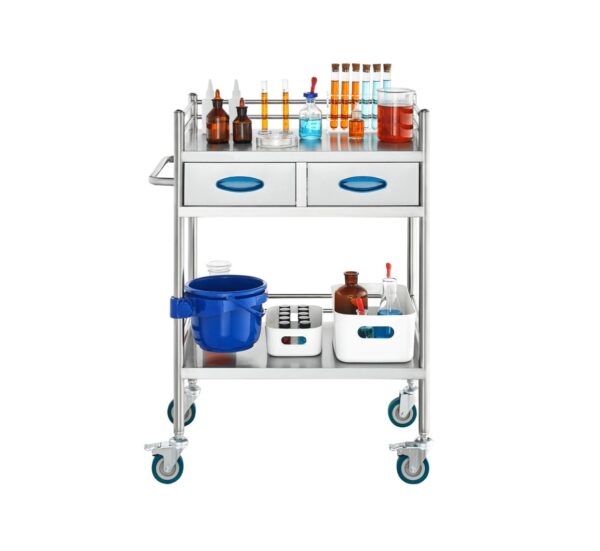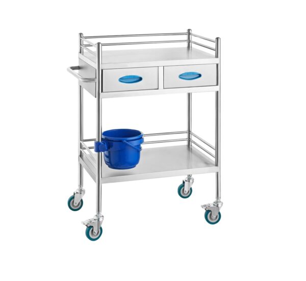 Tavoline profesionale inox me 2 rafte dhe 2 sirtarë, e pajisur me rrota me fren për lëvizje të lehtë dhe stabilitet.